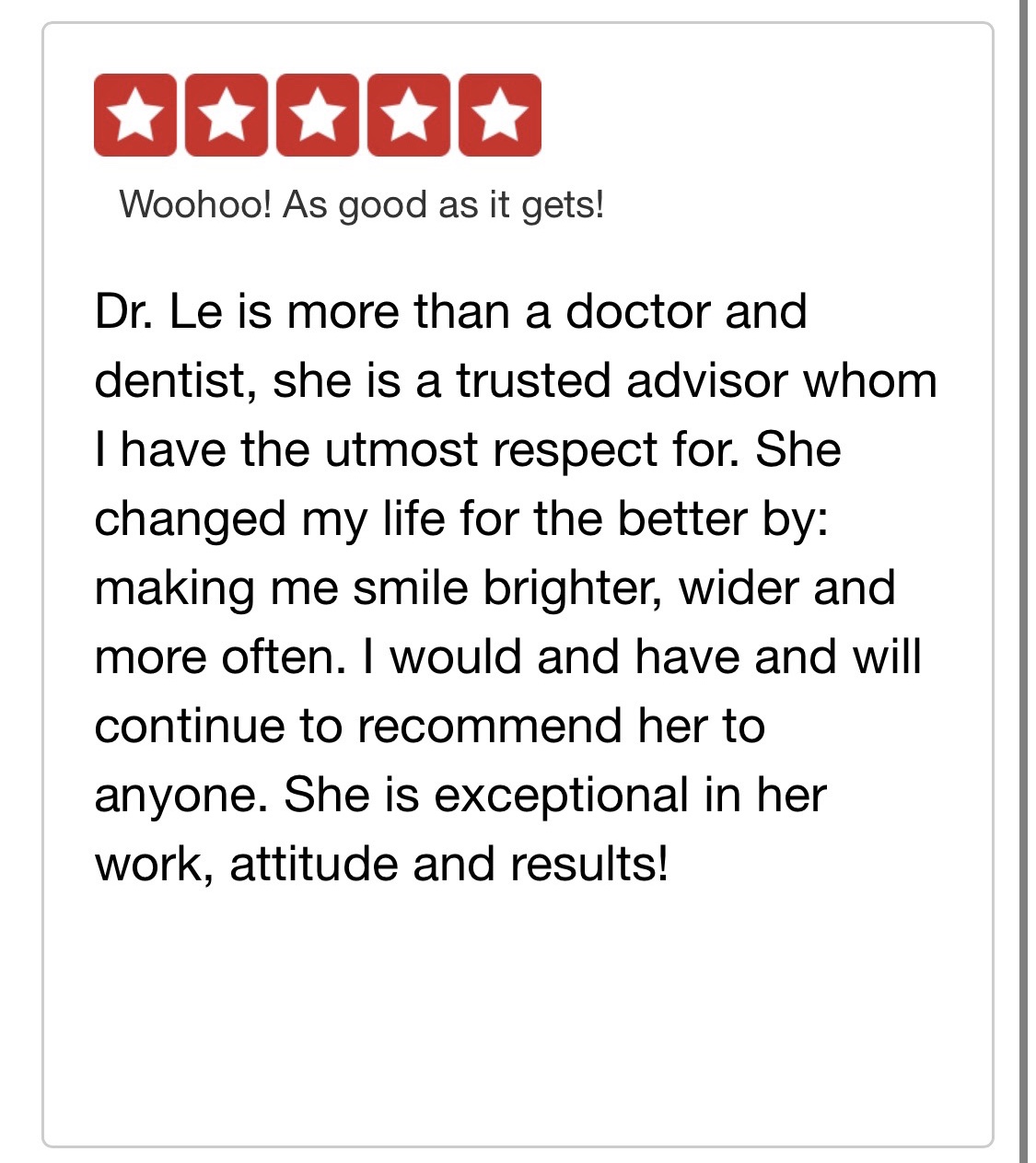 Dentistry is not all about just a filling or a cleaning, but it is life changing. My wonderful lady patient in the picture above did not have teeth in the back for over 20 years and wanted something new even at her age. She’s lived without knowing that she can have a set of teeth that would forever change how she feels about herself, and make her look 20 years younger and to chew on her back teeth. Boy, she made me cry with her when she got to go home with her new teeth…